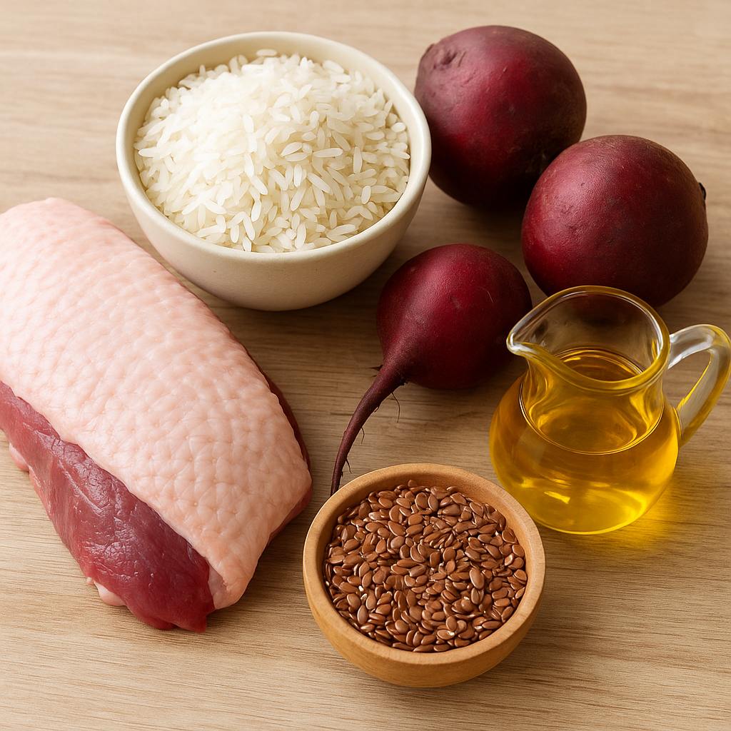 Kaczka (mięso mięśniowe 87%), ryż, buraki czerwone, siemię lniane, olej lniany, składniki mineralne